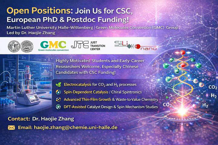Image credit: GMCThe Green Molecules Conversion (GMC) Group, led by Dr. Haojie Zhang, invites highly motivated students and early-career researchers to apply for joint training positions, CSC-supported PhD programs, and European PhD/Postdoctoral fellowships.