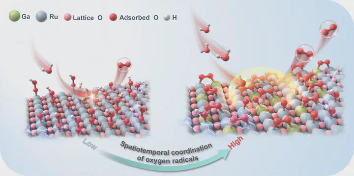 Advancements in proton-exchange membrane water electrolyzer depend on developing oxygen evolution reaction electrocatalysts that synergize high activity with stability. Here, we introduce an approach aimed at elevating oxygen evolution reaction performance by enhancing the spatiotemporal coordination of oxygen radicals to promote efficient O-O coupling. A dense, single-atom configuration of oxygen radical donors within interconnected RuO2 nanocrystal framework is demonstrated. The stable oxygen radicals on gallium sites with adaptable Ga-O bonds are thermodynamically favorable to attract those from Ru sites, addressing dynamic adaptation challenges and boosting O-O coupling efficiency. The optimized catalyst achieves a low overpotential of 188 mV at 10 mA cm-2, operates robustly for 800 h at 100 mA cm-2 in acidic conditions, and shows a large current density of 3 A cm-2 at 1.788 V, with stable performance at 0.5 A cm-2 for 200 h, confirming its long-term viability in proton-exchange membrane water electrolyzer applications.